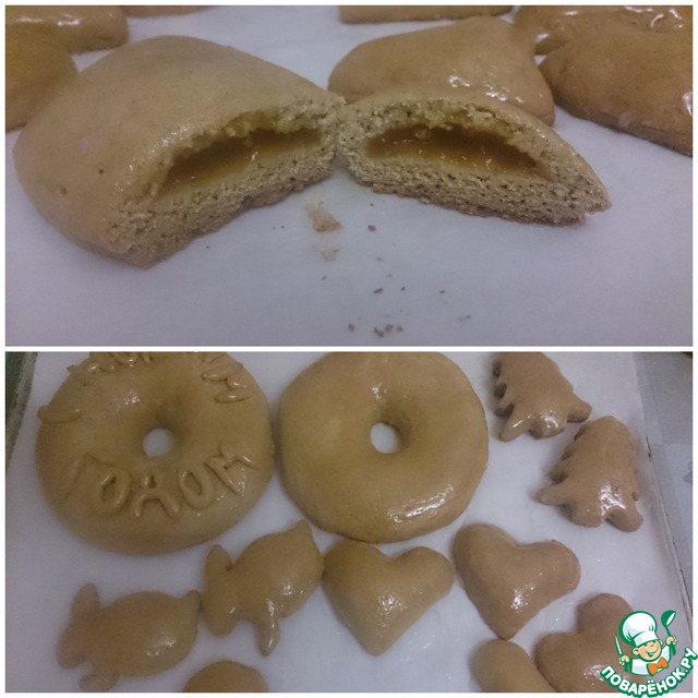 Действительно очень вкусные пряники. Позвольте опишу свой опыт для других поварят, которые только собираются приготовить пряники. Массу нагревала в кастрюле с толстым дном, специи: молота гвоздика, имбирь, корица и мускатный орех по 0.5 ч.л.. Советую после введения количества муки по рецепту убрать тесто в холодильник (уже писали ранее, этим советом я и воспользовалась), а потом при раскатке уже добавлять по необходимости. Делала начинку из свежей чёрной смородины, пробитой блендером и проваренной с сахаром и крахмалом. Выкладывала много, как в пирожки, не понравилось, следующий раз намажу тонким слоем, чтобы была тонкая прослойка. И глазурь! именно на горячие пряники, сразу из духовки.