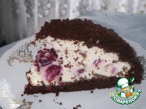 Торт выглядит как шоколадная горка... А в разрезе видно, что внутри белое нежное суфле из маскарпоне с вишнями.... Очень вкусно!!!