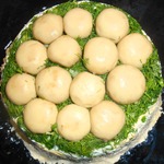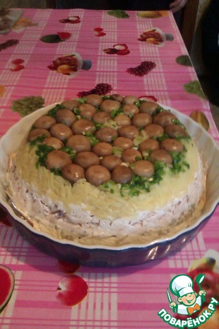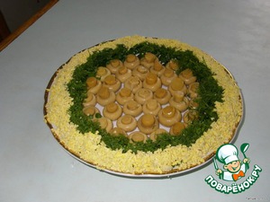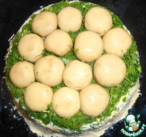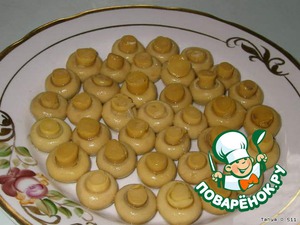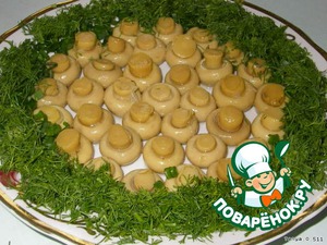 1. На середину плоского блюда выложить вверх ножками грибы.