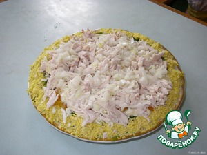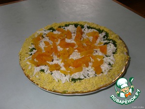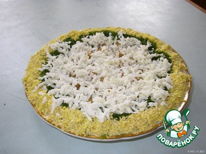 7. Твердый сыр натереть на крупной терке, покрыть майонезом.