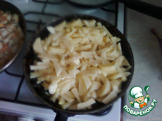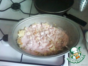 Добавляем картофель в пассеровку и поливаем соусом (майонез+кетчуп) и тушим до готовности картошки.