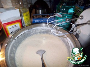 А потом ещё домешать сильно газированной воды столько, чтобы тесто стало ЖИДКИМ (для ОЧЕНЬ ТОНКИХ блинчиков (у меня ушло примерно 300 мл. Надо смотреть на консистенцию вашего теста - зависит от муки, кефира, крахмала)