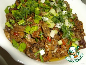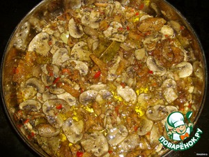 Грибы нарезать пластиками довольно крупно, лисички можно не резать. Выложить грибы в форму, перемешать с маслом.