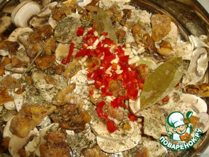 Добавить все приправы, лавровый лист, рубленный мелко чеснок и перец Чили. -