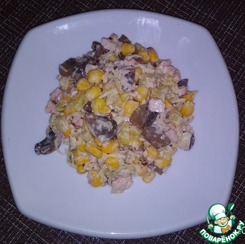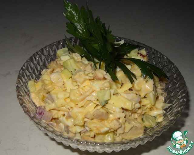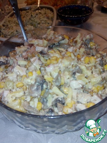 Рецепт этого салата достался мне от знакомой несколько лет назад. С тех пор я часто делаю его на праздники. Очень необычный, оригинальный вкус салата нравится всем, кто его пробовал. На сайте есть салат с таким названием, но совершенно другой.