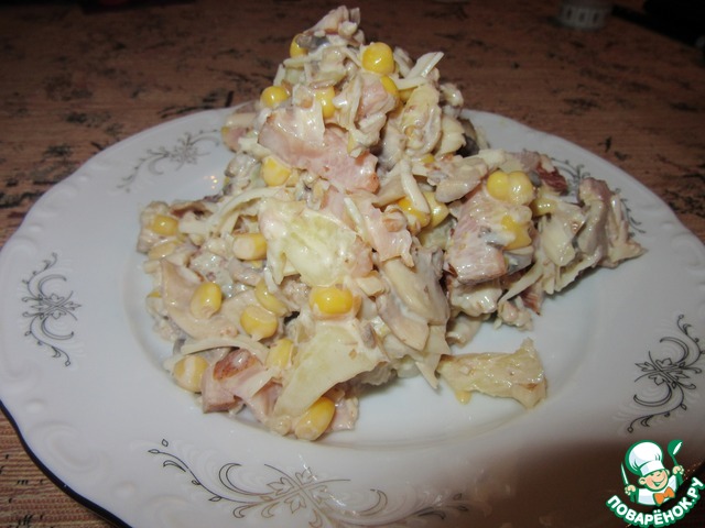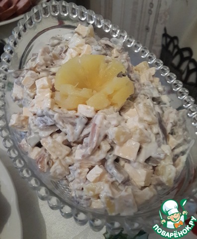 Заправить майонезом. Украсить по желанию. Я сделала цветочек из кусочков ананаса. Приятного аппетита!