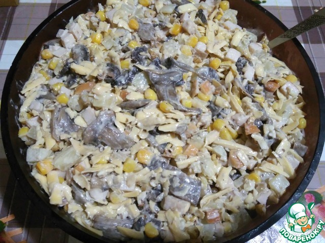 Продукты смешать в салатнике. НЕ СОЛИТЬ! Соли и так достаточно в сыре и курице.