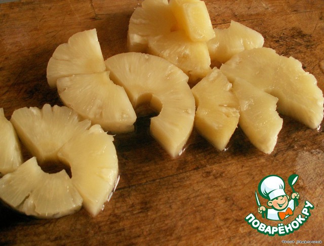 Кольца ананасов режем на 4 части. Перец режем квадратиками (у меня замороженный уже нарезан был, надо бы покрупнее).