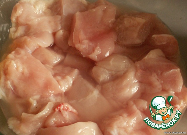 Куриное мясо режем кубиками.