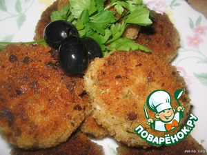 Формируем круглые котлетки, в серединку каждой котлетки, кладём маслинку. Обмакиваем в яйцо, потом в сухари (обильно). Обжариваем на растительном масле, на разогретой сковороде. Сначала на сильном огне, чтобы образовалась корочка, а потом огонь убавляем и доводим до готовности.