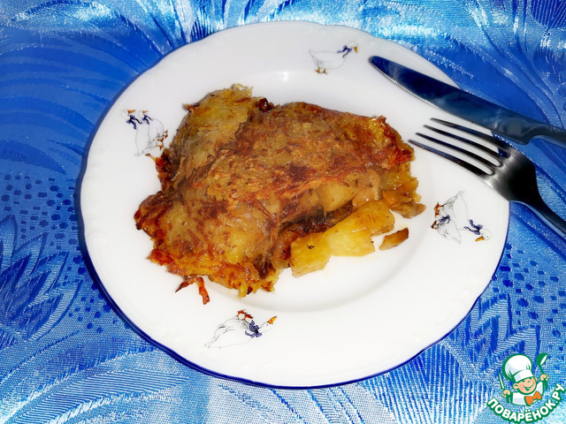 В форму для запекания, выкладываем картофельные оладушки. Немного внахлёст друг на друга. Несколько штук оставить для верха.