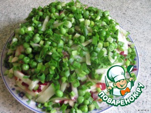 Украсить оставшимися огурцами, зеленым горошком и луком. Выдержать в холодильнике 2 часа.