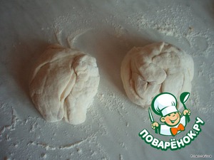 Стол посыпать мукой. Вынимаем наше тесто, делим на две части.