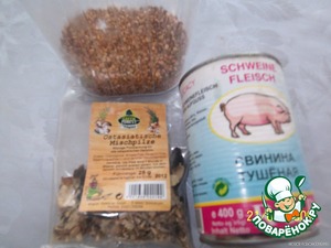 • 1. Сухие грибы замочить в кипятке до размягчения. Я просто залила кипятком и накрыла крышкой , а сама занялась остальными продуктами..