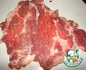 Лучше брать готовые эскалопы, но если нет просто берем мясо (у меня свинина). Режем на плоские большие куски.