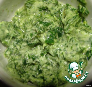 Шпинат (у меня замороженный)порежем мелко и смешаем с сыром.