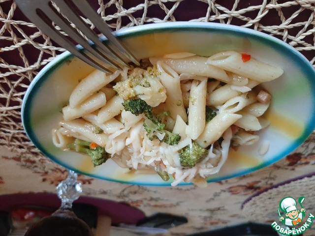Одновременно с брокколи поставить варить макароны. Лучше всего при варке добавить в воду пару ложек растительного масла.