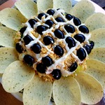 А дальше - самое интересное. На желтке майонезом рисуем сеточку. В каждую ячейку укладываем четвертинку черной оливки (они разрезаются вдоль).