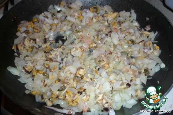 Коктейль и лук обжарить на сковородке в небольшом количестве растительного масла