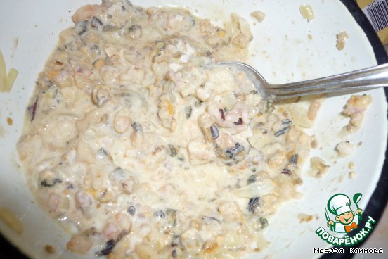 • Обжаренный с луком коктейль смешать с майонезом, посолить, поперчить