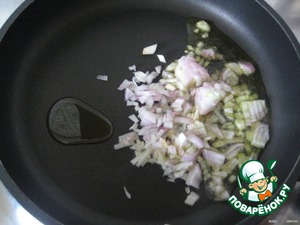 • В разогретой сковороде на сливочном масле поджарить лук, мелко нарезанный.