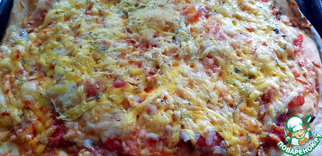 Положить на тесто бекон и сверху посыпать сырной массой.