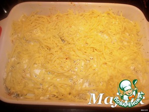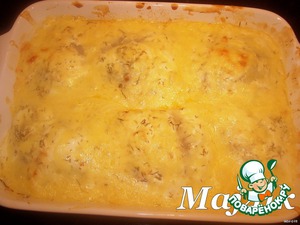 Завёрнутый голубчик хорошенько обмакнуть в заливку и выложить в смазанную маслом форму. -