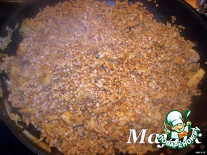 Добавить гречку, всё хорошенько перемешать, обжаривать ешё 5 минут.