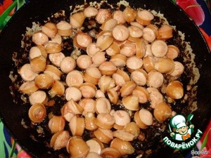 Сосиски нарезать "пятачками" и обжарить на растительном масле.