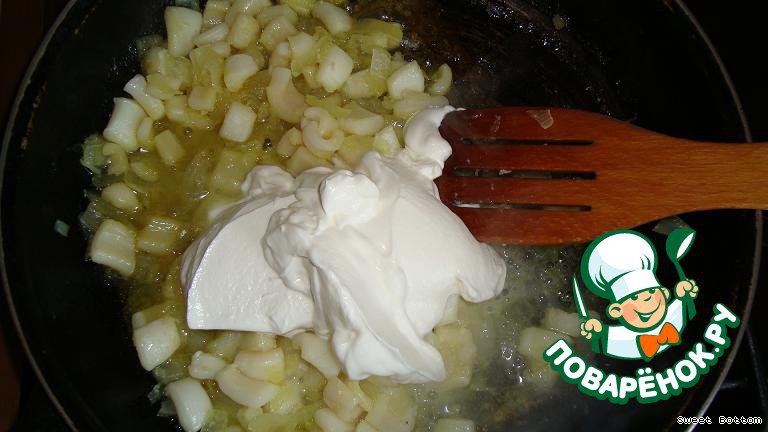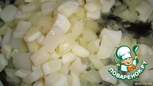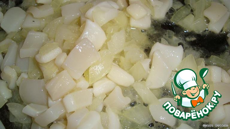 Добавить мелконарезанного кальмарa (сырой), обжарить. -