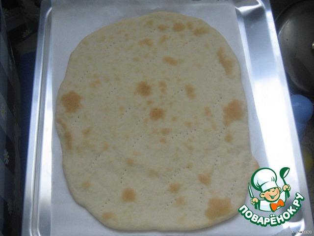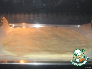 Пока мы это делаем, тесто поднялось. Его надо раскатать (если липнет, можно скалку смазать растительным маслом), наколоть вилкой и поставить в духовку при температуре 180-200 градусов минут на 15. Я еще включала гриль, чтоб сверху зарумянилось -
