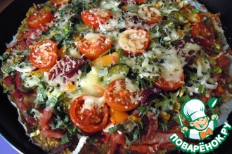 Вот такой получается корж. На него выкладываем начинку - промазать майонезом, положить лук, колбасу, помидоры и посыпать сыром