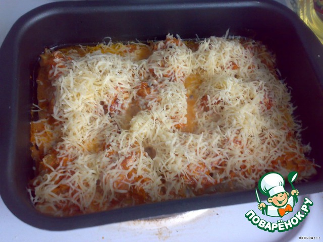 Ставим в духовку на 20мин. Затем вынимаем и посыпаем тертым на мелкой терке сыром