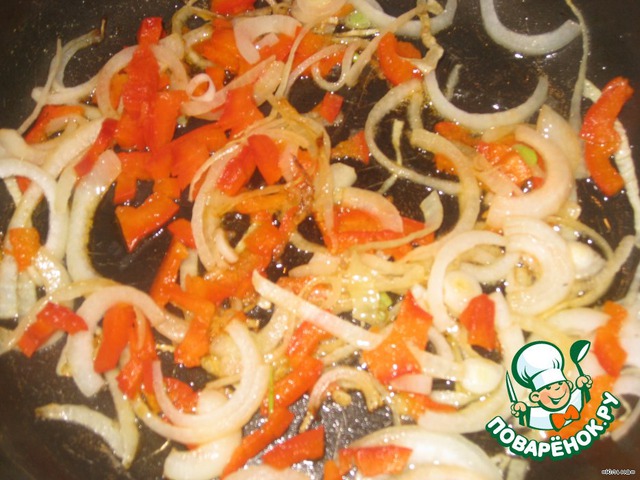 Лук режем полукольцами, перец - кубиками не очень большими, обжариваем, добавляем тертый на крупной терке помидор.