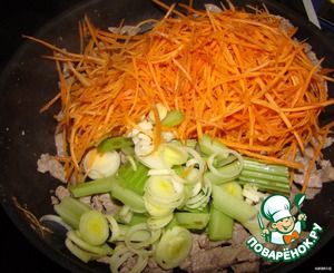 Морковь потрем на терке для корейских салатов, черенок сельдерея порежем на небольшие кусочки, лук (у меня порей) порежем