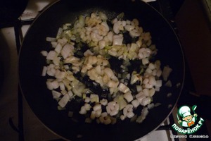 Очищенную тушку кальмара нарезать мелкими кубиками и обжарить до готовности вместе с мелко нарезанной луковицей.
