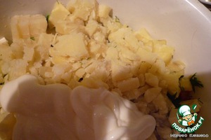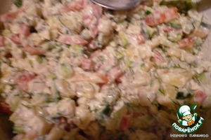 Картофель нарезать кубиками, салат посолить и заправить майонезом