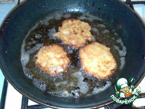 Нагреть на сковороде растительное масло, налить в него ложкой тесто и жарить с двух сторон.