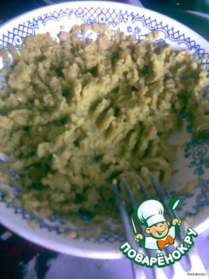 • Горошек размять вилкой или тоже на блендере.Приготовить заправку из сметаны,хрена и соли.Заправить салат.Можно намазать на хлеб.Мы вчера ели,намазывая на грибные ромбики.