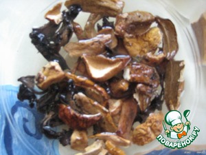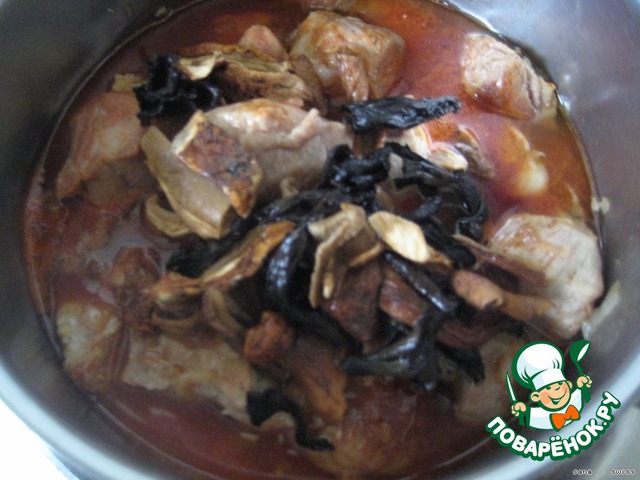 • Добавим вымоченные грибы, сахар, "хмели-сунели", лавровый лист, и немного бульона, что бы почти покрыло мясо и тушим на маленьком огне до мягкости мяса.