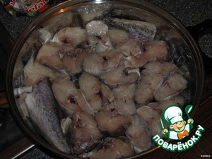 Рыбку размораживаем, очищаем от внутренностей и плавников. Режем на кусочки толщиной около 1.5-2 см. Далее промываем и складываем слоями в миску. Положили слой - сверху присыпаем солью и поливаем соком лимона, еще слой - снова соль и сок лимона - так пока не закончатся кусочки. Оставляем пропитываться минут на 20-30.