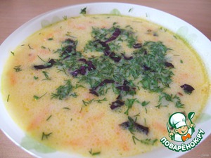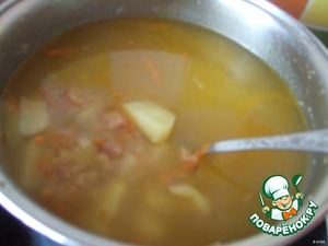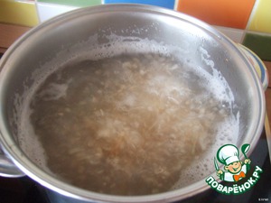 • Крупа наша закипела и через 2-3 минуты добавляем зажарку. Закипело, и еще через пару минут трем на терке сырок. Всё хорошо перемешаем. Как только наш супчик закипел выключаем (если электроплита) или убавляем на минимум (газ) и даём настояться ещё пару минуток. К этому времени все ингредиенты должны быть готовы.