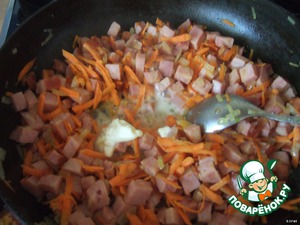 • Натертую морковь добавляем в зажарку и можно добавить сливочного маслица. Всё хорошо поджарить- потомить.
