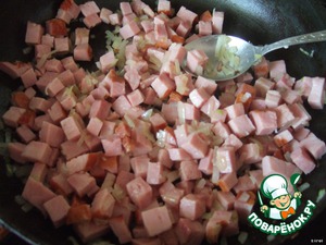 • Режем мелко лук и обжариваем его слегка на сковороде с растительным маслом, добавляем нарезанную ветчину (остался в холодильнике с праздника совсем небольшой кусочек). Обжариваем.