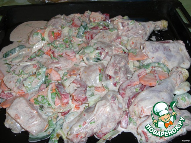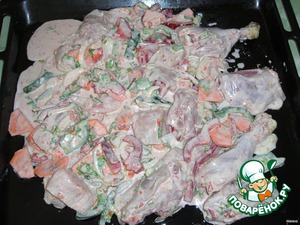 Приготовить соус из майонеза, томата, чеснока, перца, соли, базилика, все перемешать. Обвалять в этом соусе курочку (нарезанную небольшими кусками), лук (полукольцами), морковка (кольцами), перец болгарский (полукольцами).