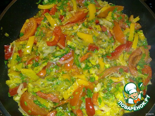 Добавить нарезанный сладкий перец, жарить 2-3 минуты, помешивая