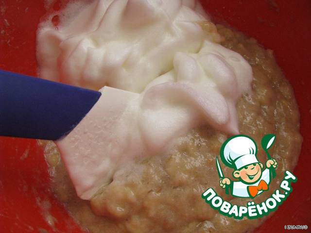 Взбить до пиков белок с добавлением лимонного сока и добавить к бананам.