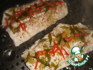 • Филе судака положить в пароварку, приправить солью и перцем, полить соком лайма (не меньше половины сока нужно оставить), сверху присыпать цедрой лайма, луком и половиной измельченного перца чили.