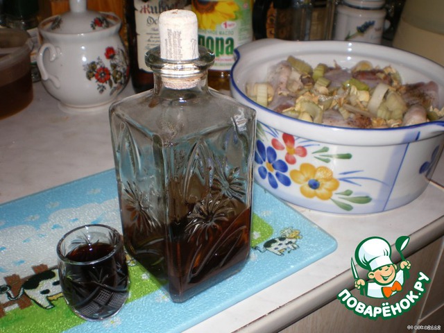 Туда же влить 2 рюмки коньяка.Подлить кипячёной водички до половины объёма на котором находятся кусочки курицы.