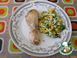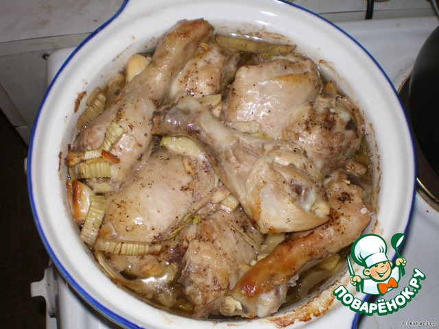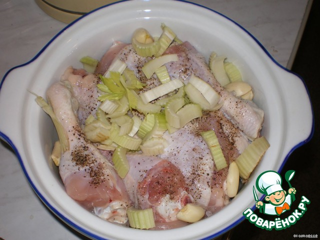 Кусочки курицы поперчить,посолить,положить в кастрюльку.И добавить много крупно порезанного чеснока, порезанный сельдерей,петрушку.
